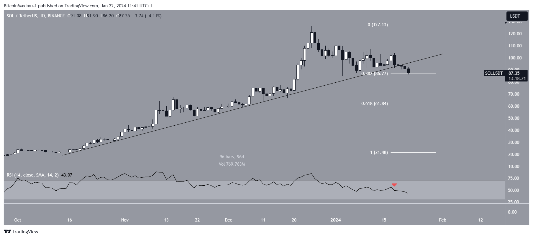 Da allora, tuttavia, il prezzo di SOL è crollato. Il 19 gennaio 2024 ha rotto la linea di tendenza ascendente di supporto. All’epoca, la linea di tendenza era in vigore da 96 giorni. Attualmente, SOL scambia all’interno del livello di supporto del ritracciamento di 0,382 Fib.