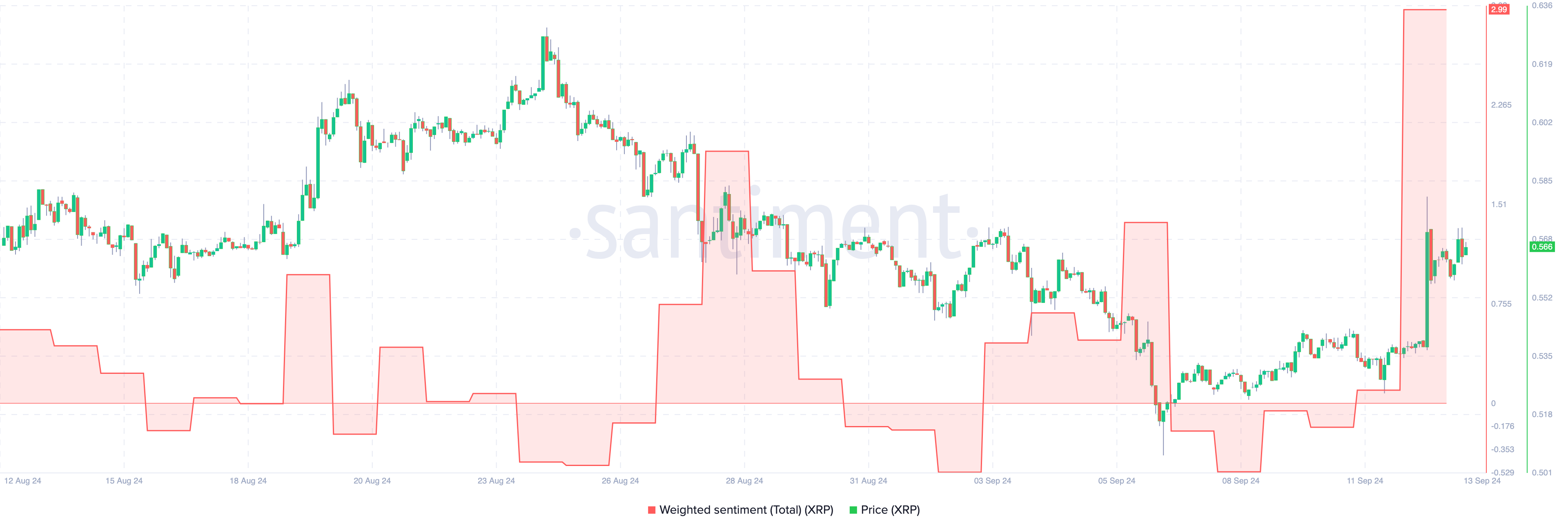 Anche se il prezzo si è poi stabilizzato a 0,56 USD, i dati on-chain di Santiment rivelano un significativo picco nel Sentimento Ponderato, raggiungendo il livello più alto in oltre un mese. Il Sentimento Ponderato traccia il volume sociale per valutare se il mercato è orientato al rialzo o al ribasso su un progetto.