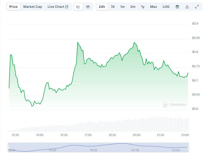 Entro sei ore dal lancio, MOVE attualmente scambia a 74 centesimi, raggiungendo una capitalizzazione di mercato di 1.6 miliardi USD. L’attività di trading è aumentata, con quasi 450 milioni USD di volume registrato nei primi 90 minuti.