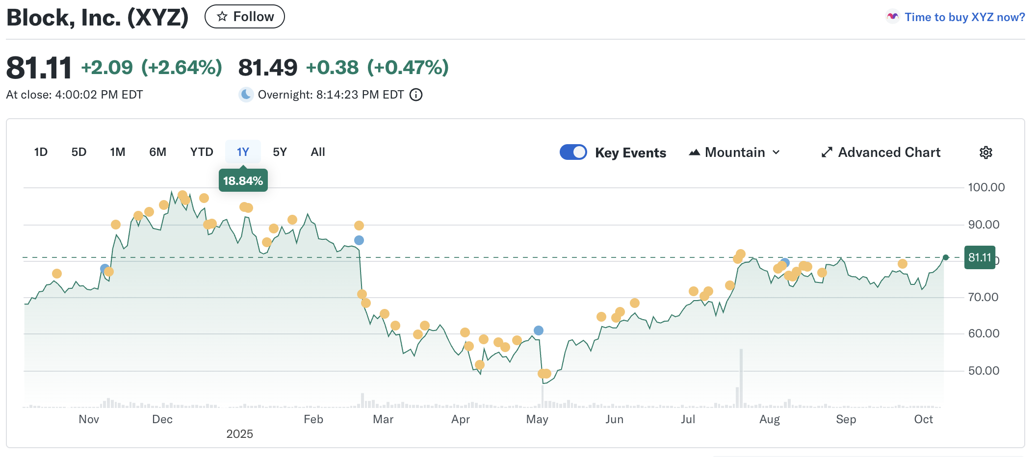 Le azioni di Block (XYZ) hanno chiuso in rialzo del 2,64% a $81,11. Nonostante il rimbalzo, il titolo rimane in calo del 4,5% dall’inizio dell’anno. Le azioni di Block erano salite oltre $90 all’inizio di quest’anno prima di scendere a circa $46 a inizio maggio, e da allora sono in costante crescita.