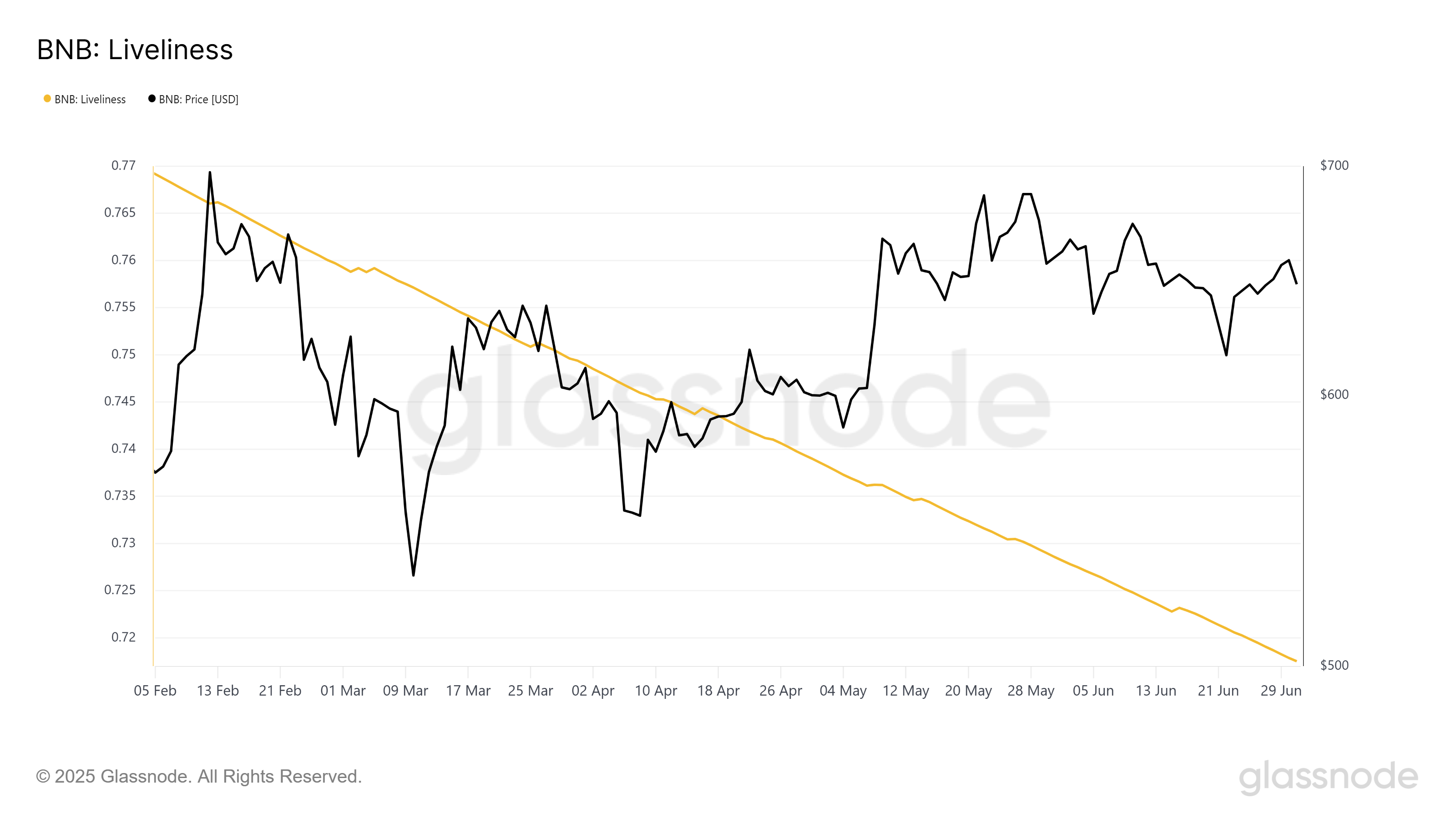 La vivacità indica che i LTH hanno raramente mosso le loro posizioni negli ultimi cinque mesi, e il costante calo dell’indicatore è un segno di ciò. Il basso movimento da parte dei LTH aiuta a prevenire grandi vendite, fornendo un supporto cruciale al prezzo. Questa stabilità favorisce un ambiente per una graduale ripresa e consente a BNB di mantenere un prezzo stabile.