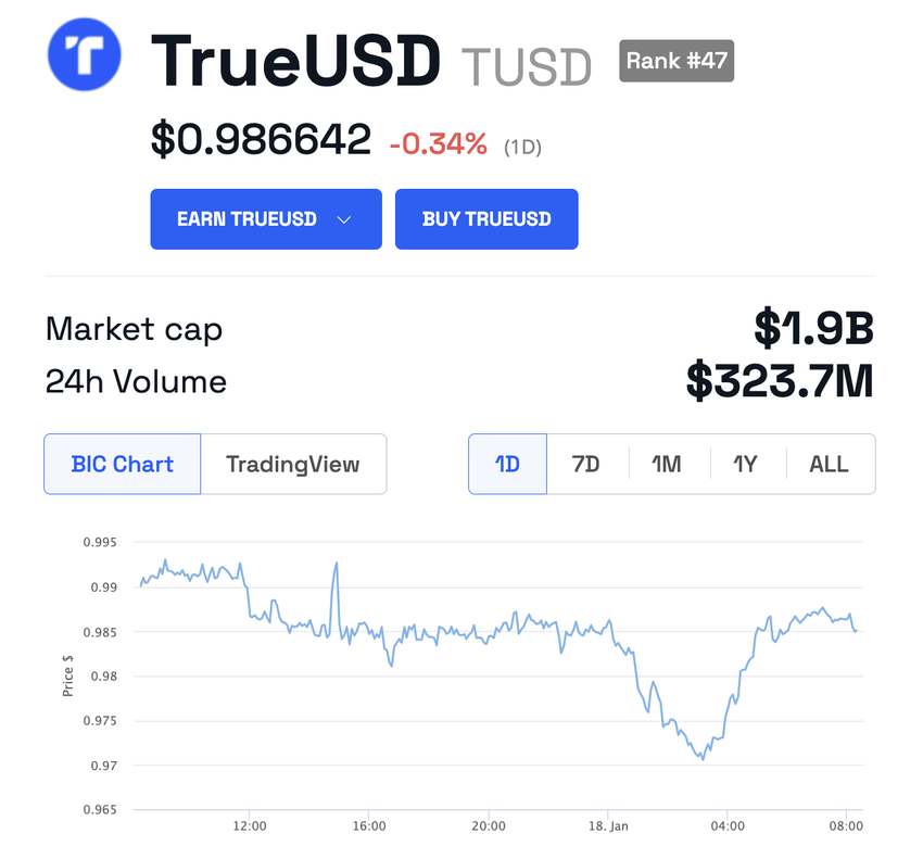La capitalizzazione di mercato di TrueUSD è di 1,9 miliardi di dollari, il che la rende la quinta stablecoin più grande dopo USDT, USDC, DAI e FDUSD. Al momento della stesura di questo articolo, il prezzo del token non è ancora risalito a 1 dollaro.