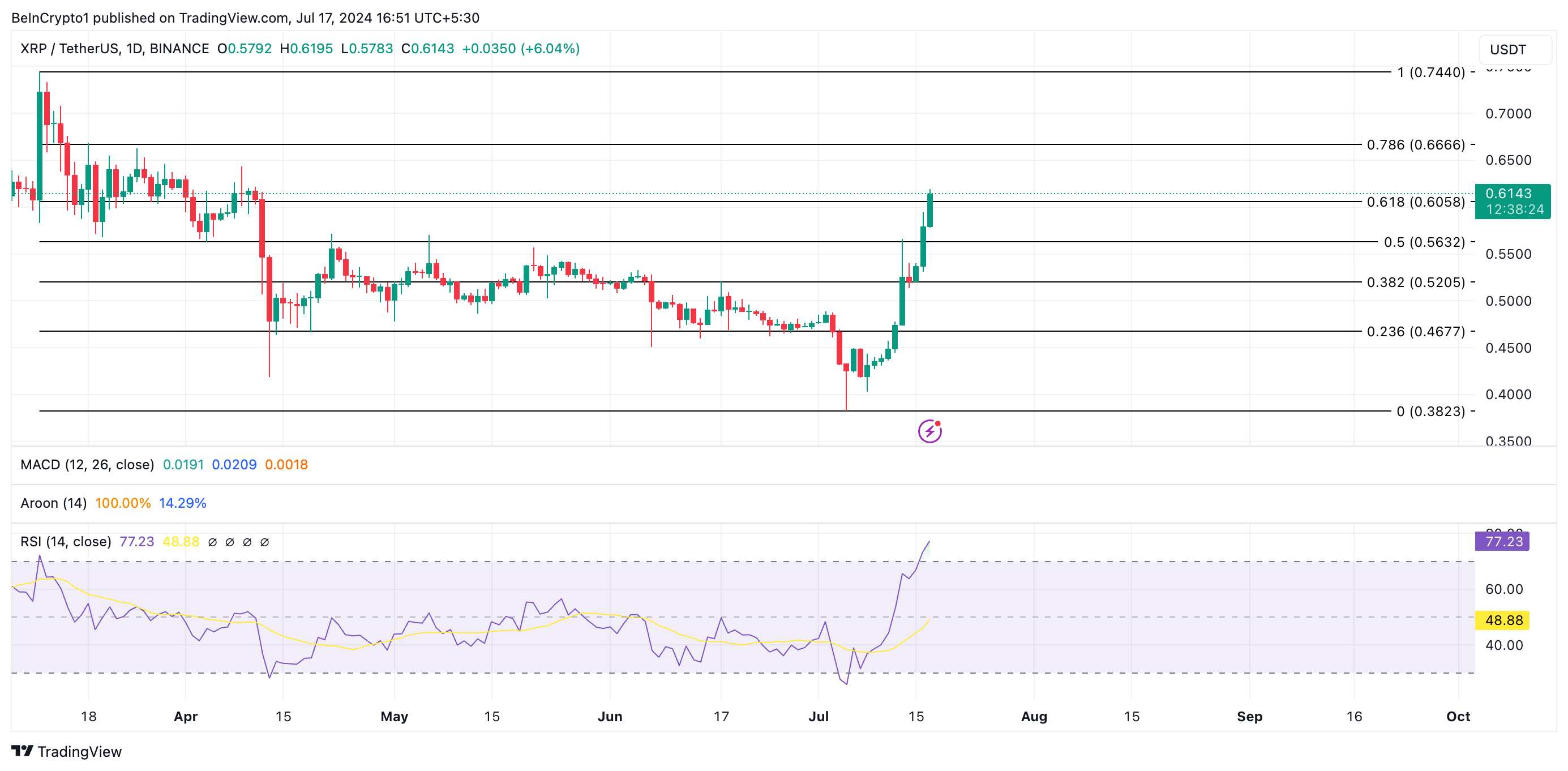L’aumento del prezzo di Ripple (XRP) del 38% negli ultimi sette giorni lo ha spinto a un massimo plurimensile. Il token scambia attualmente a 0,61 dollari, un livello di prezzo osservato l’ultima volta il 12 aprile.
