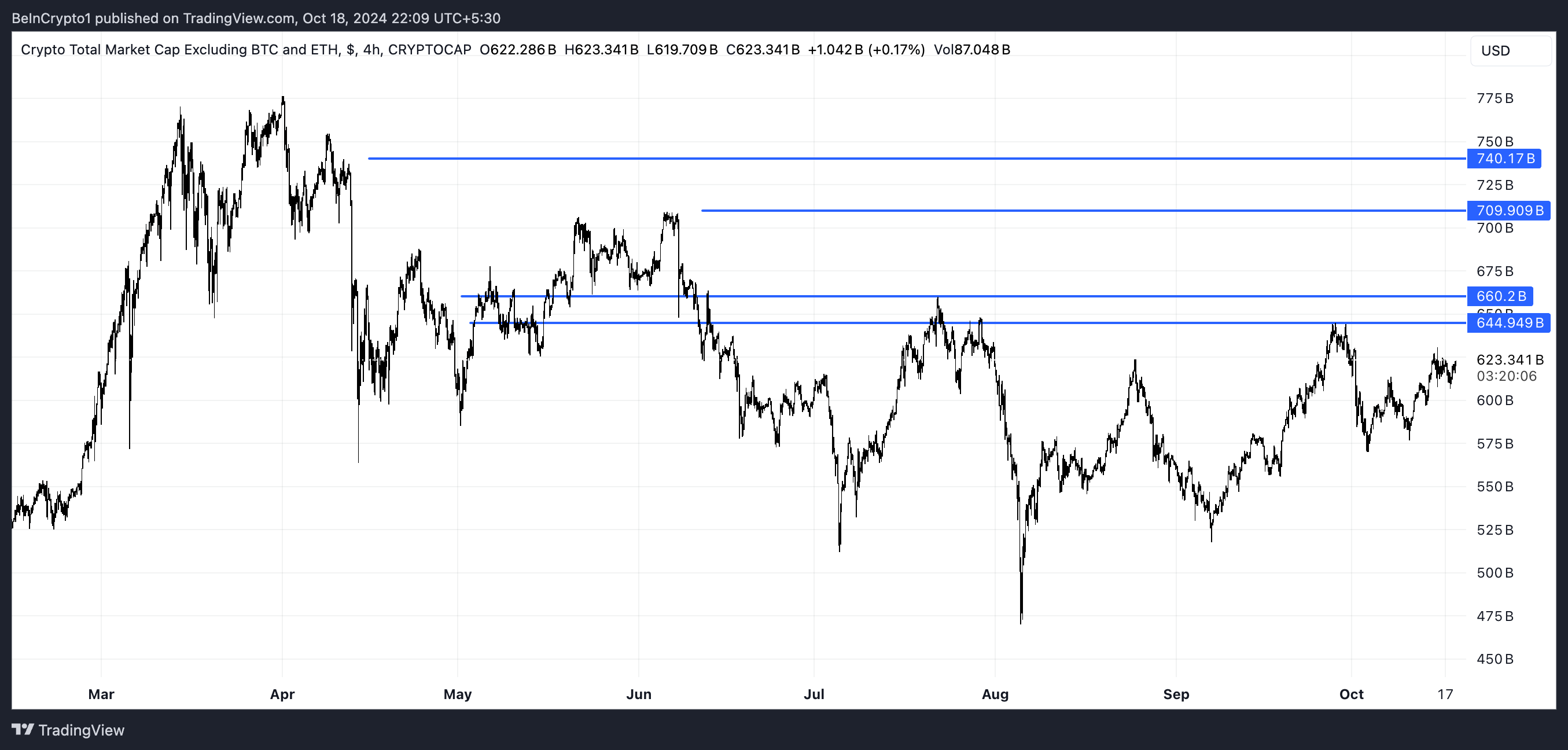 Se questa resistenza viene superata, il mercato delle crypto, escludendo BTC e ETH, potrebbe assistere a un significativo rally, testando capitalizzazioni di mercato intorno a 660 miliardi USD, 709 miliardi USD e persino 740 miliardi USD. Questo rappresenta un potenziale aumento del 20% dai livelli attuali, evidenziando la volatilità e l’opportunità nel settore delle altcoin.