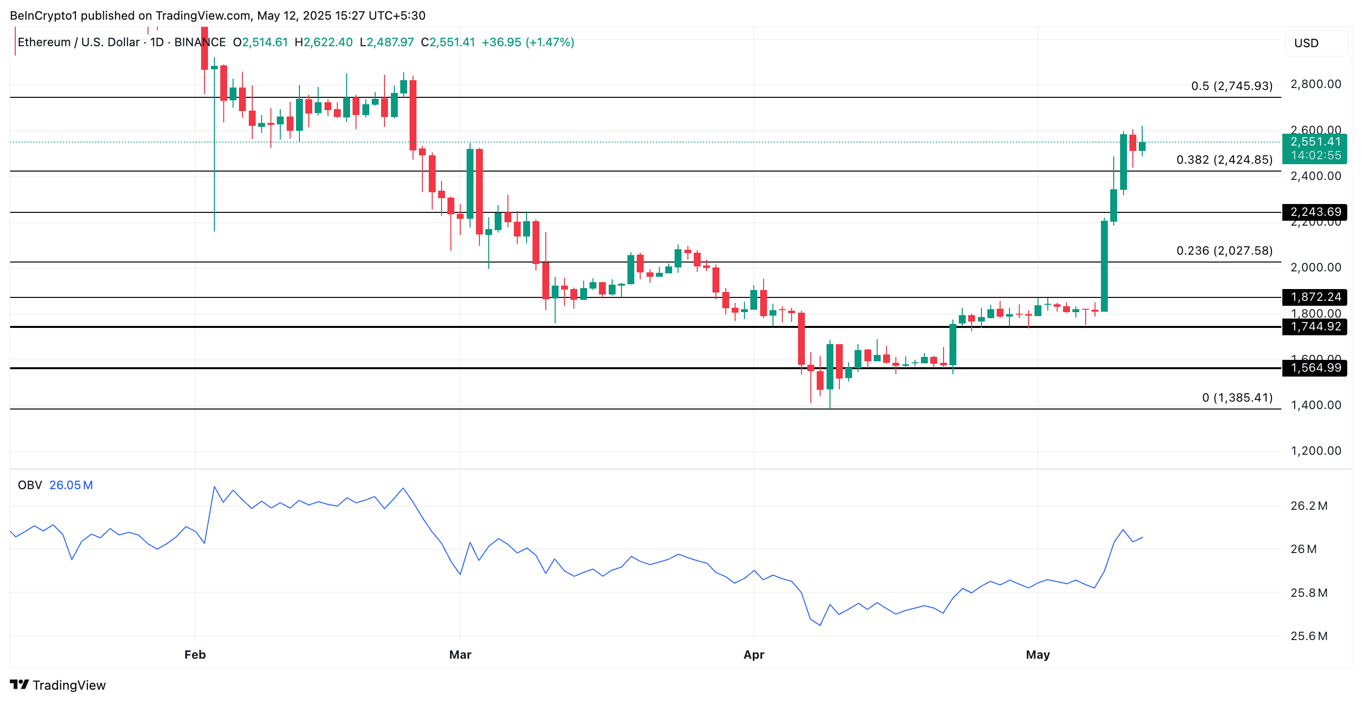 Quando l’OBV di un asset aumenta, segnala che la pressione d’acquisto sta crescendo, il che può portare a ulteriori aumenti di prezzo. Se questo trend persiste, il prezzo di ETH potrebbe salire a $2.745.
