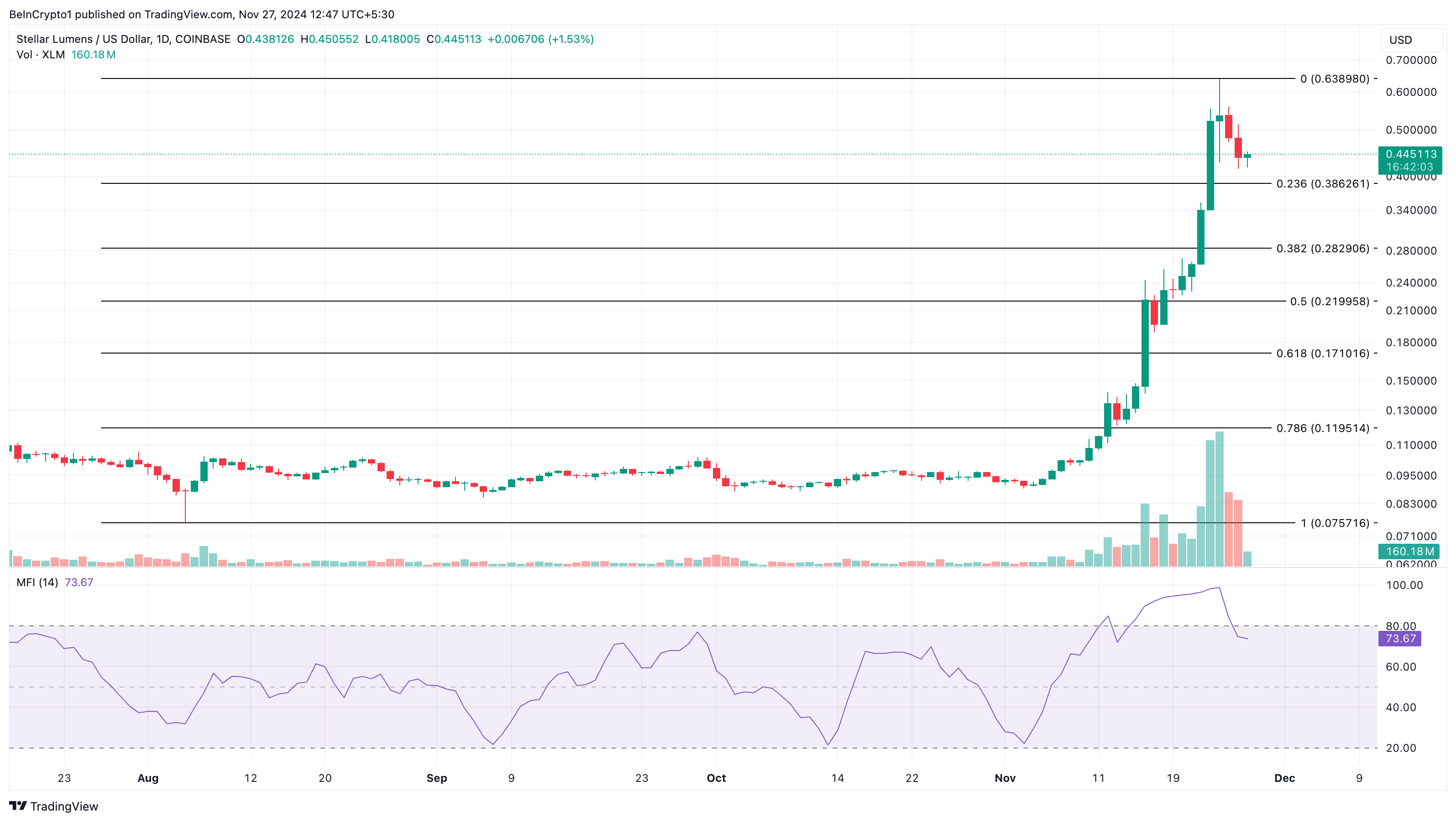 Quando la lettura è sopra 80,00, è ipercomprato. Ma quando è sotto 20,00, è ipervenduto. Come visto sotto, l’MFI ha raggiunto la zona di ipercomprato prima di ritracciare. Considerando le condizioni attuali, il prezzo di XLM potrebbe scendere a 0,28 USD.