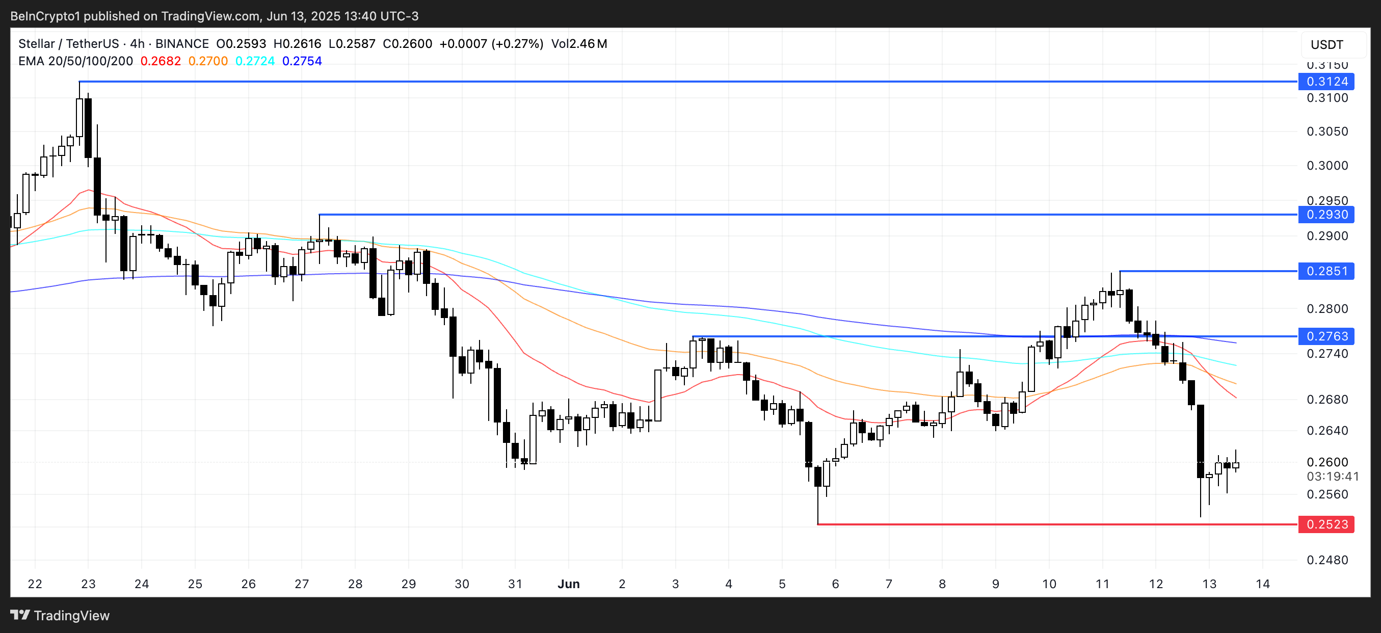 Stellar (XLM) è scambiato ai suoi livelli più bassi in un mese, in calo del 14% negli ultimi 30 giorni e del 5% nelle ultime 24 ore a seguito dell’escalation del conflitto Israele-Iran. Il recente calo ha spinto diversi indicatori tecnici in territorio ribassista, con il prezzo che oscilla vicino a livelli di supporto critici.