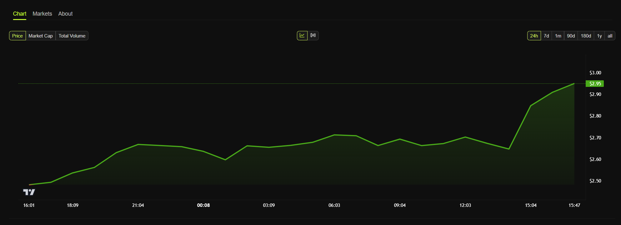 SUI ha raggiunto un massimo storico all’inizio di gennaio ma è sceso di oltre il 50% da allora. Tuttavia, la partnership di oggi con World Liberty Financial, affiliata a Donald Trump, ha riportato un momentum rialzista per l’altcoin.