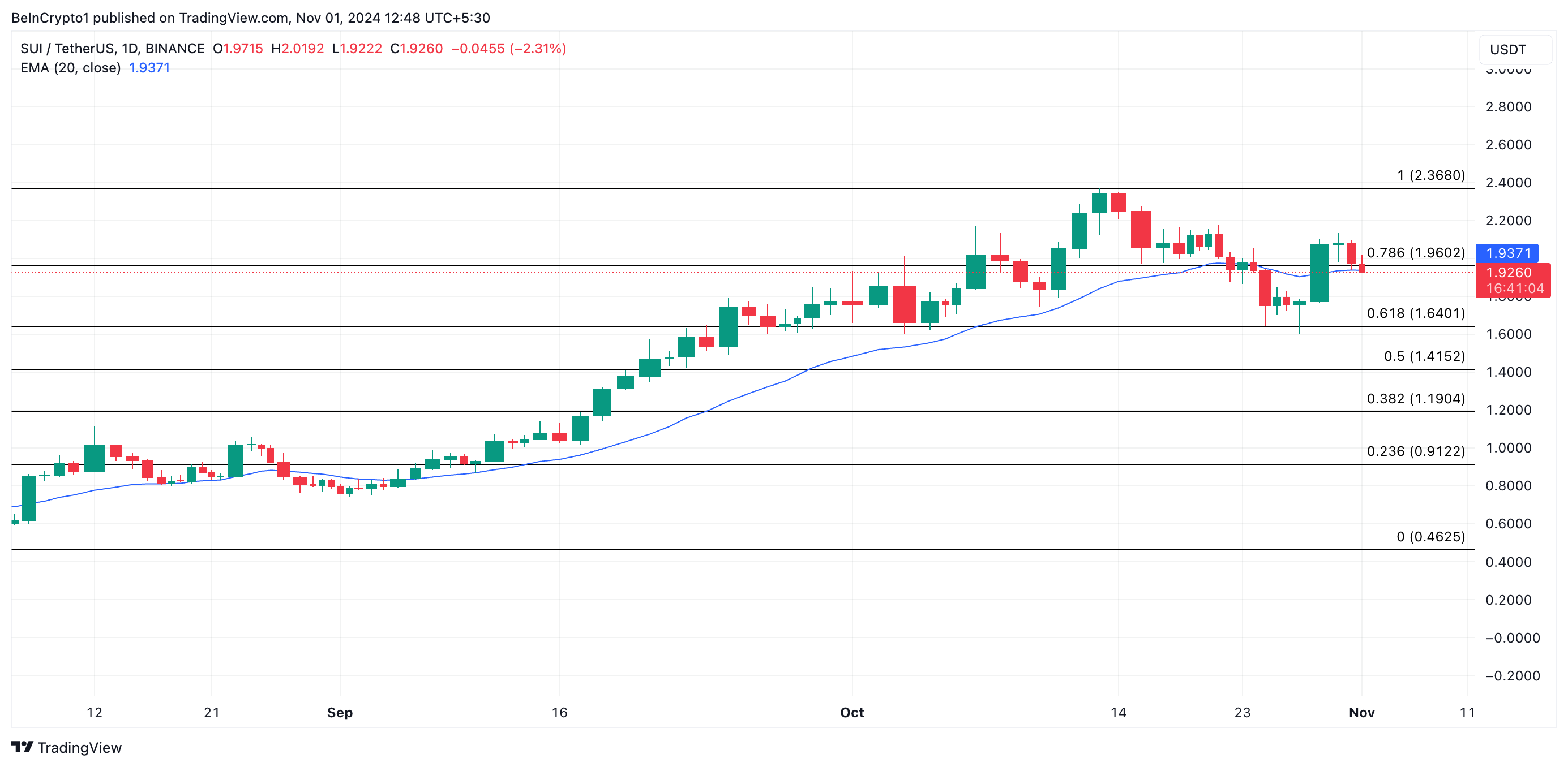 SUI attualmente si scambia appena sopra la sua media mobile esponenziale di 20 giorni (EMA), che fornisce un supporto critico a 1,94 USD. L’EMA di 20 giorni, che riflette il prezzo medio dell’asset negli ultimi 20 giorni di trading, spesso segnala una tendenza al rialzo quando i prezzi si trovano sopra di essa e funge da livello di supporto chiave.