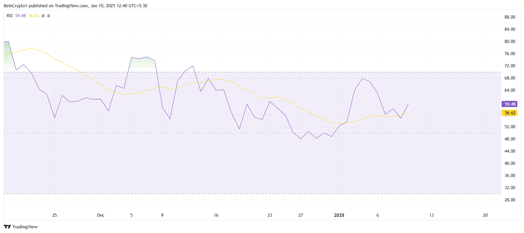 Gli indicatori tecnici supportano il sentimento rialzista per SUI, con l’Indice di Forza Relativa (RSI) che si mantiene saldo nella zona rialzista. Negli ultimi giorni, l’RSI è rimasto sopra la linea neutra di 50.0, un segnale che il momentum favorisce gli acquirenti rispetto ai venditori.