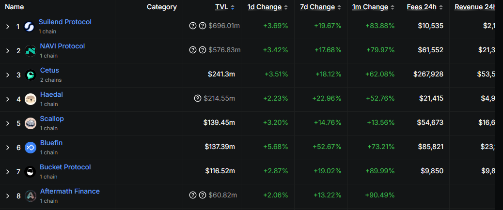 Nel frattempo, i protocolli di prestito basati su Sui hanno visto un aumento del 78,86% nel TVL nell’ultimo mese. Incentivi di liquidità aumentati, rendimenti elevati e crescente attenzione da parte di partecipanti DeFi retail e istituzionali sono i motori di questa crescita. Un importante motore è il NAVI Protocol, la piattaforma di prestito e prestito di punta di Sui.