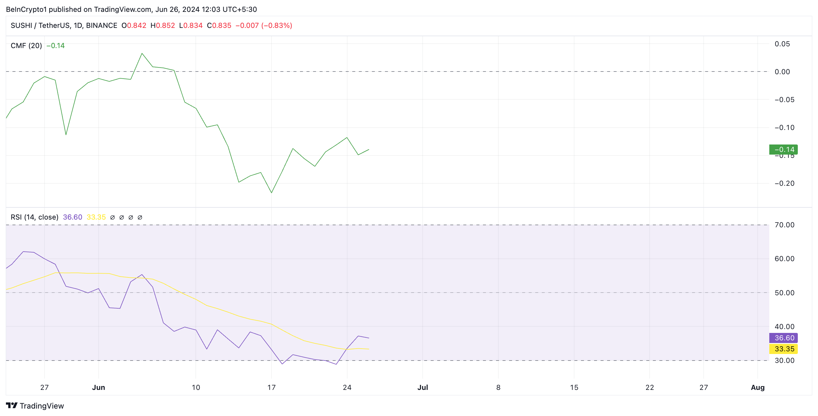 Al momento della stampa, il CMF di SUSHI è pari a -0,14. Questo indicatore misura il flusso di denaro in entrata e in uscita da un asset. Un valore negativo del CMF suggerisce un’uscita di liquidità e spesso è un precursore di un calo sostenuto dei prezzi.