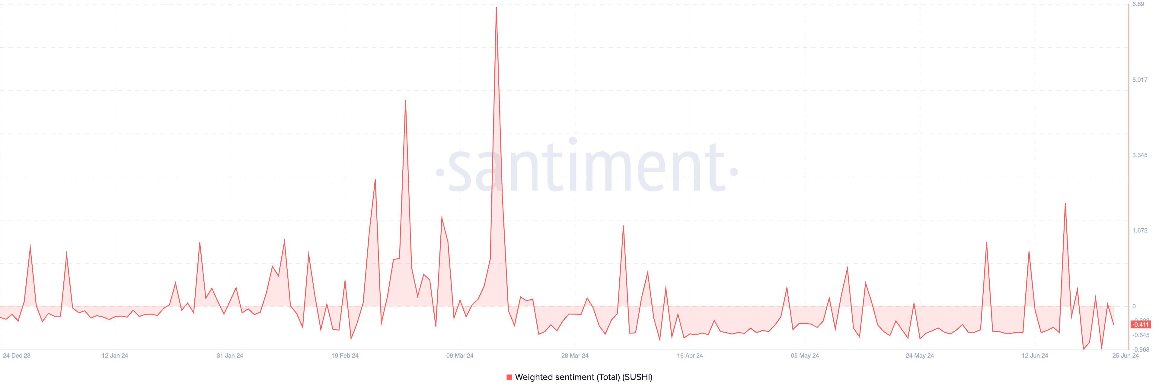 Sebbene sia iniziata una certa attività di acquisto, il mercato di SUSHI rimane dominato da sentimenti negativi. Al momento in cui scriviamo, il sentiment ponderato del token è pari a -0,41.