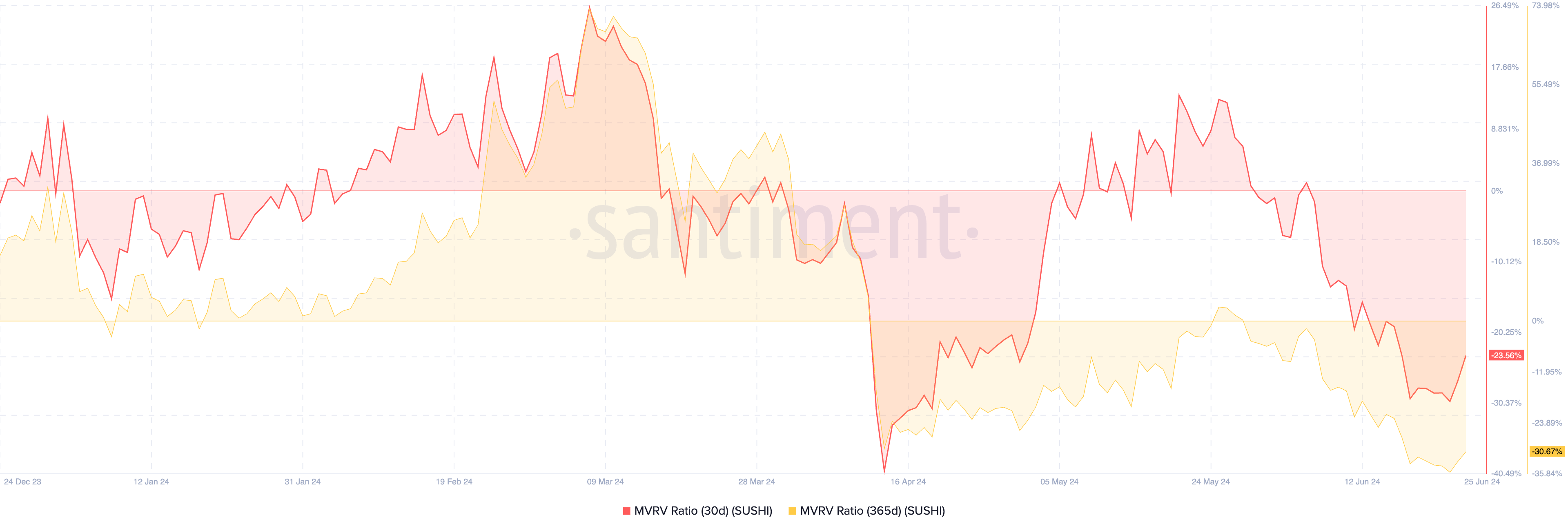 I rapporti MVRV di SUSHI, calcolati utilizzando le medie mobili a 30 e 365 giorni, sono rispettivamente -23,56% e -30,67% al momento della scrittura.