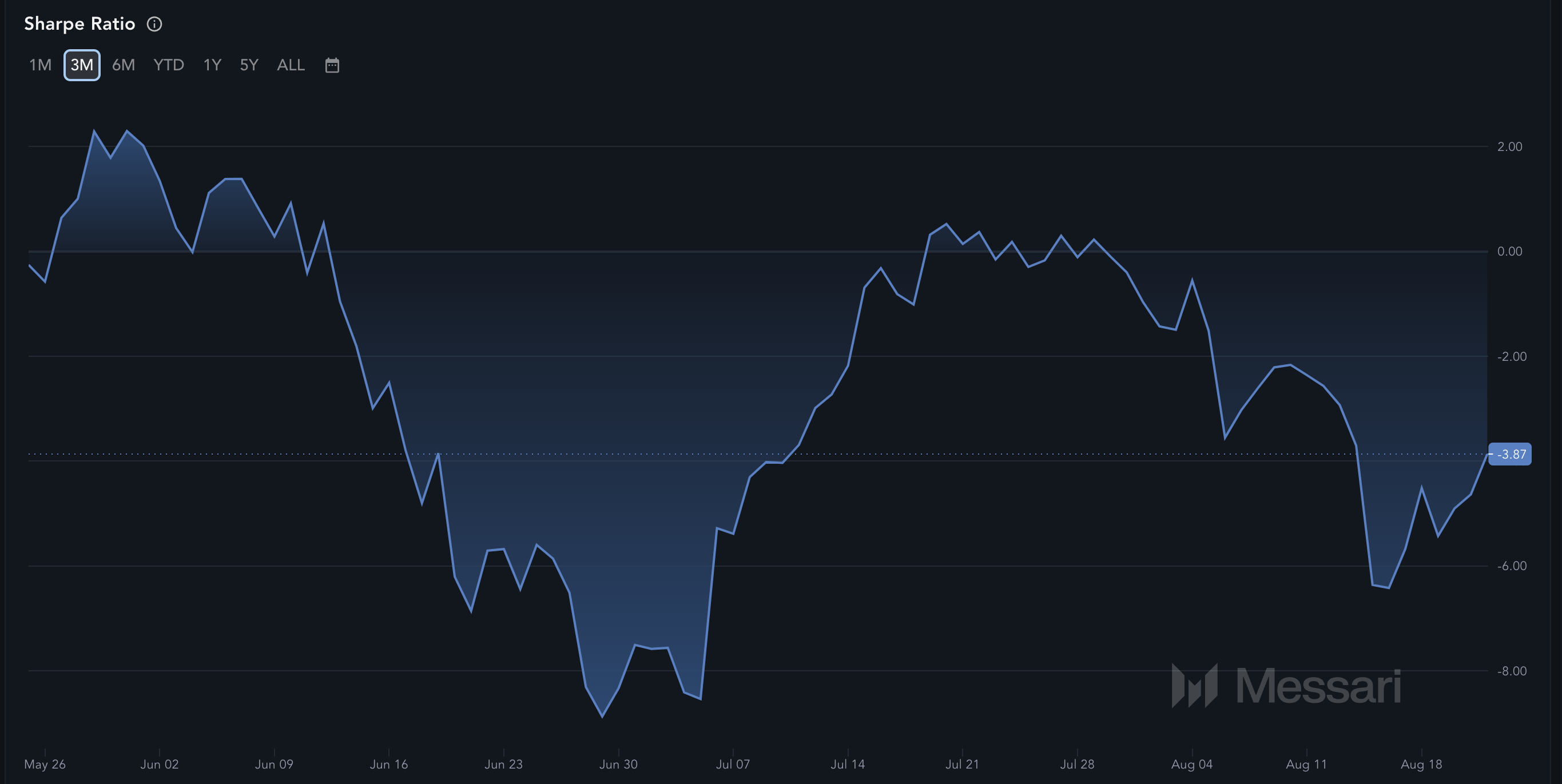 Secondo Messari, lo Sharpe ratio di SHIB era pari a -5,43 il 19 agosto, in coincidenza con un calo del prezzo a 0,000012 dollari. Attualmente, il rapporto è migliorato a -3,87, segnalando che SHIB potrebbe essere sulla strada di una migliore redditività per gli investitori.