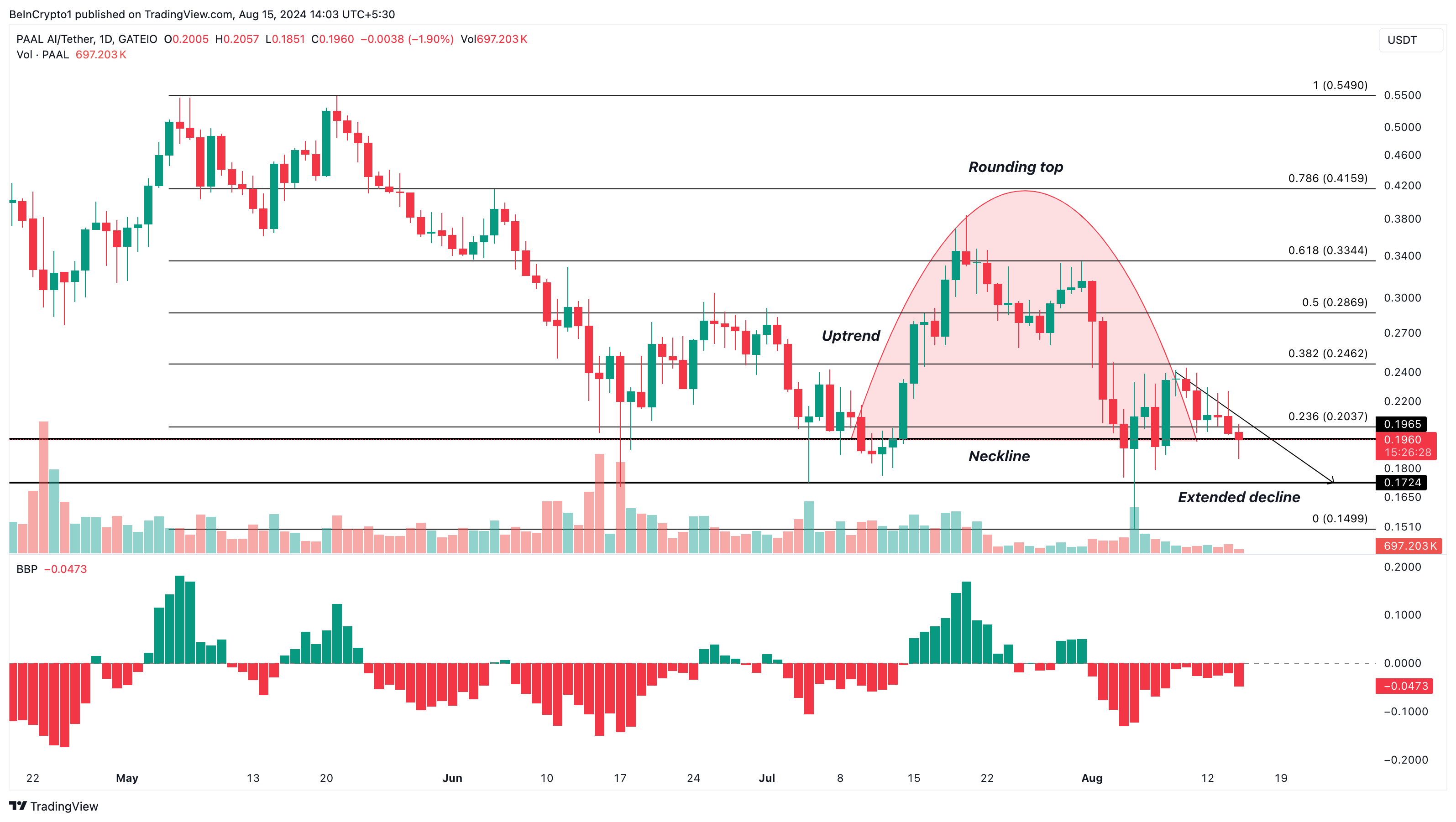 Sulla base del grafico giornaliero, PAAL ha formato un pattern rounding top. Conosciuto anche come rounding bottom invertito, questo modello è caratterizzato da un rialzo iniziale, dopo il quale il rialzo perde vigore e il prezzo scende.