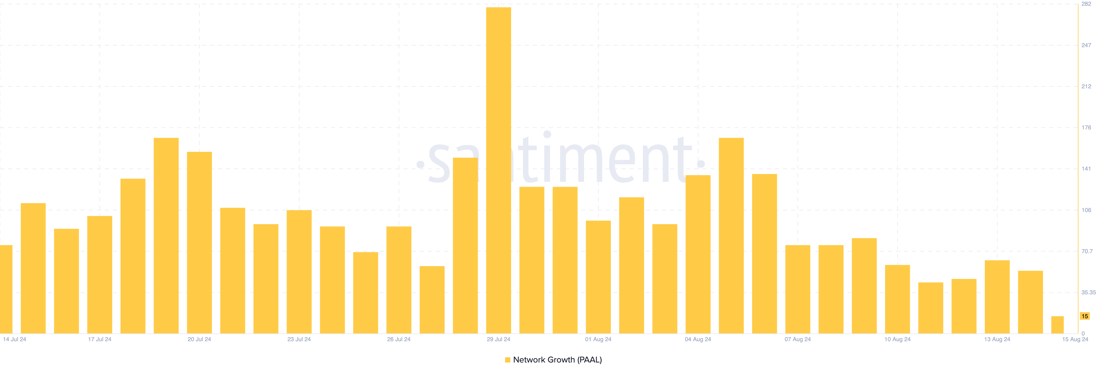 Sponsored SponsoredSe le whale di criptovalute continuano a liquidare le loro partecipazioni in PAAL, il prezzo potrebbe continuare a scendere. Oltre a questa pressione di vendita, i dati sul blockchain di Santiment mostrano un calo significativo della crescita della rete del progetto.