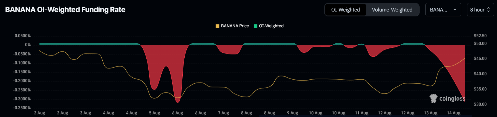Tuttavia, il tasso di finanziamento di BANANA mostra attualmente una forte tendenza ribassista, che riflette lo scetticismo diffuso tra i trader. Questo sentimento negativo fa seguito al recente crollo, che ha portato a una visione cauta e a una minore fiducia nell’asset.