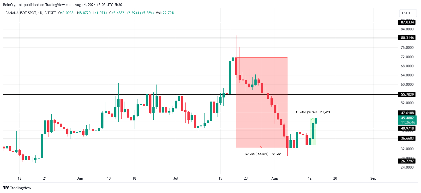 Se la resistenza di 47 dollari si consolida come un minimo supporto, il prezzo di BANANA potrebbe salire fino a 55 dollari. Tuttavia, poiché la moneta di Telegram ha precedentemente registrato un consolidamento tra 47 e 55 dollari, il rialzo potrebbe fermarsi qui.