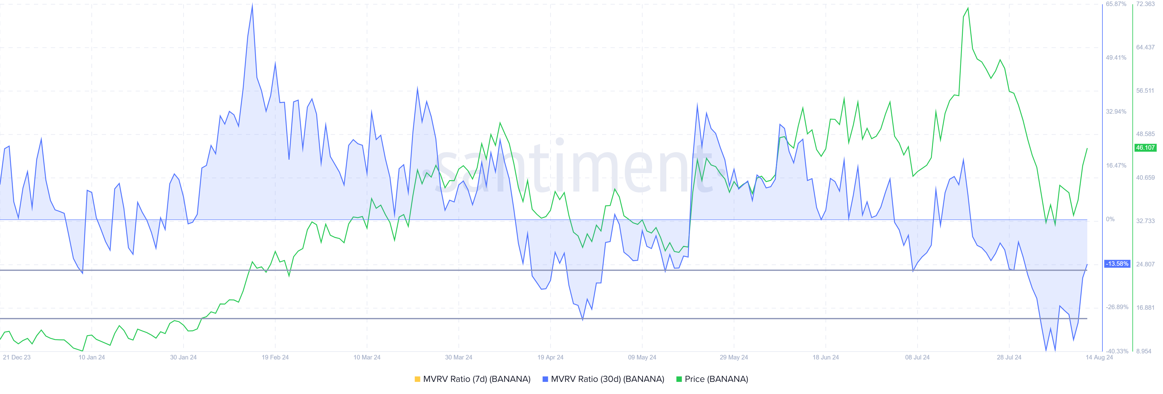 Il rapporto MVRV valuta i profitti e le perdite degli investitori. Attualmente, il MVRV a 30 giorni di BANANA è a -13%, il che indica una possibile pressione di vendita.