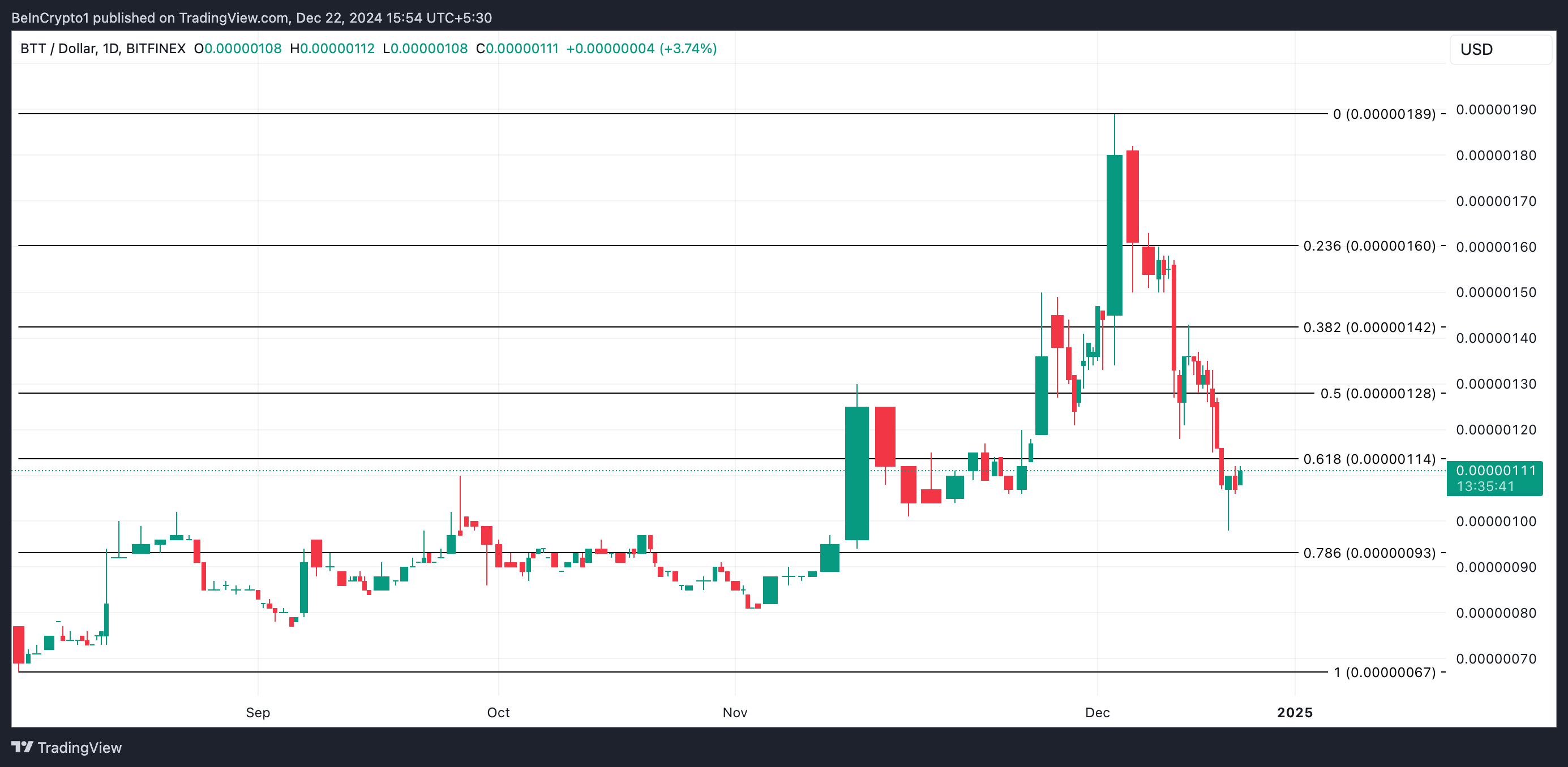 Tuttavia, mentre questo aumento può riflettere un rinnovato interesse per il token e un potenziale cambiamento nel sentimento del mercato, le letture dai grafici del prezzo di BTT suggeriscono una correzione a breve termine.