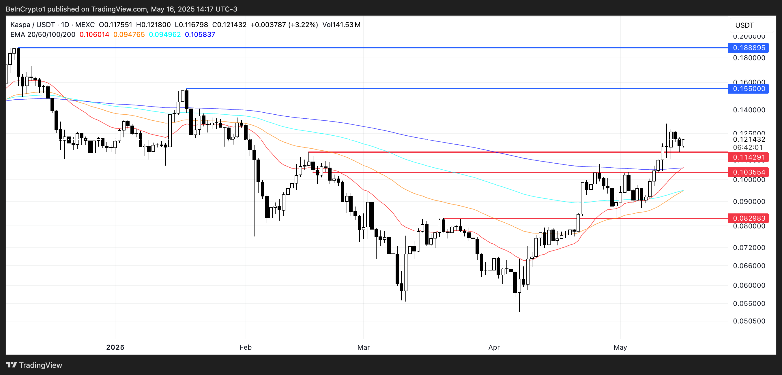 Gli indicatori EMA suggeriscono una potenziale formazione di una golden cross, che potrebbe segnalare un ulteriore rialzo. Se il momentum continua, KAS potrebbe testare la resistenza a $0,155, e un breakout di successo potrebbe spingere il prezzo verso $0,188, rendendola una delle monete Made in USA più interessanti per il weekend.