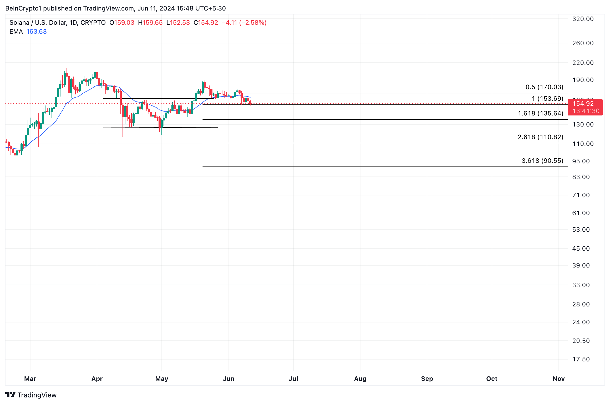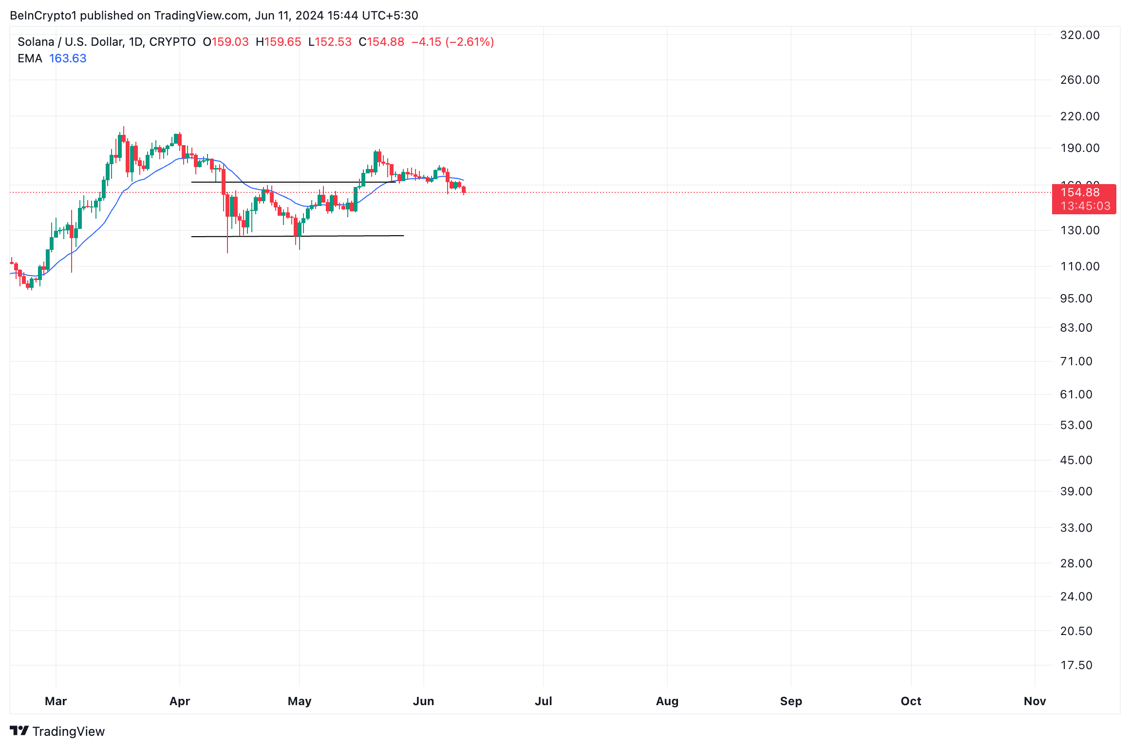 Al momento della stampa, Solana (SOL) scambia a 154 dollari, scendendo del 5% sotto il livello di breakout. L’altcoin scambia attualmente al di sotto della sua media mobile esponenziale (EMA) a 20 giorni.