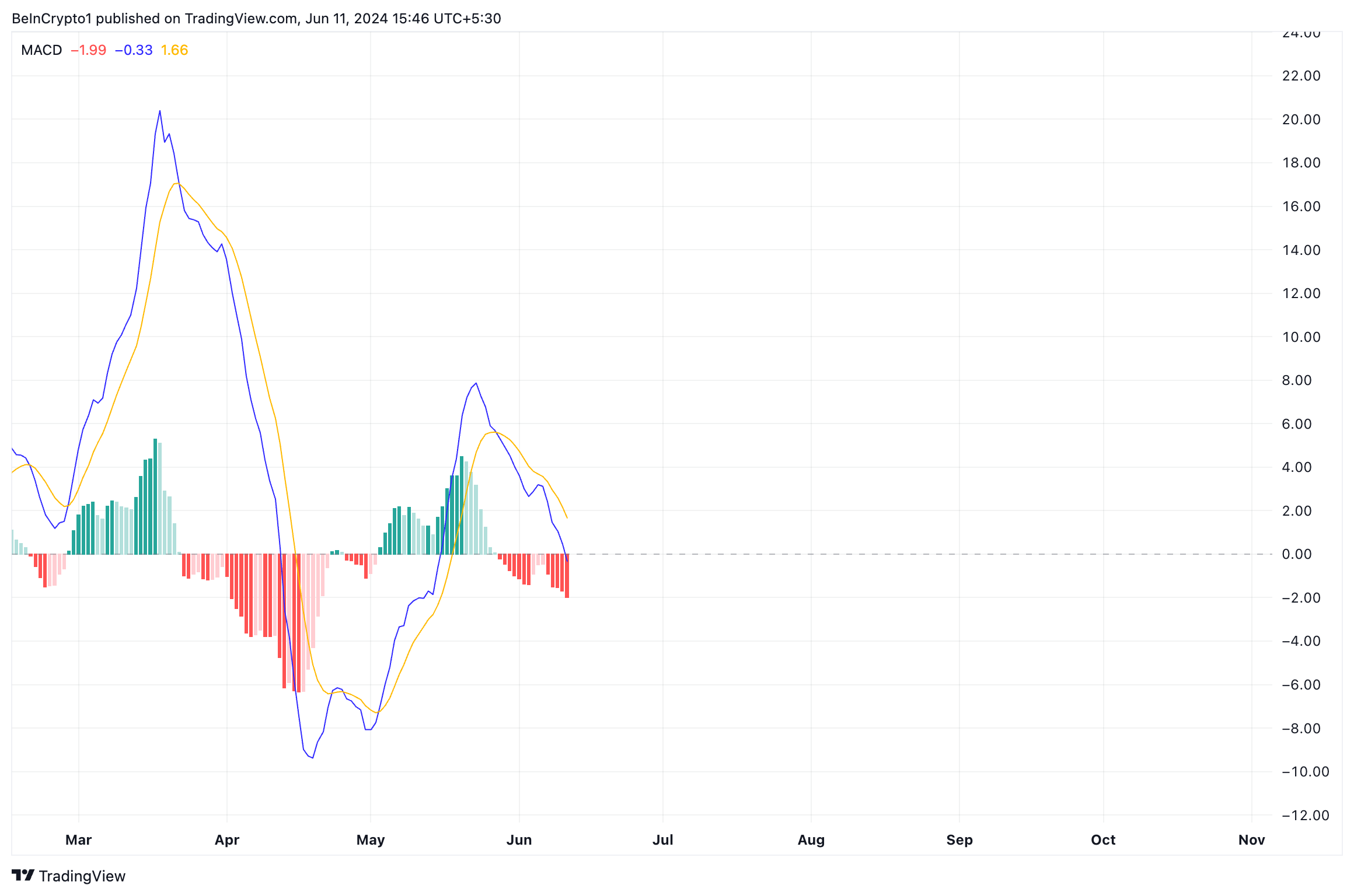 Le letture del MACD (Moving Average Convergence Divergence) di SOL hanno confermato l’aumento della pressione di vendita tra i partecipanti al mercato. La linea MACD della moneta (blu) si trova attualmente al di sotto del segnale (arancione) e ha una tendenza verso la linea dello zero al momento in cui scriviamo.