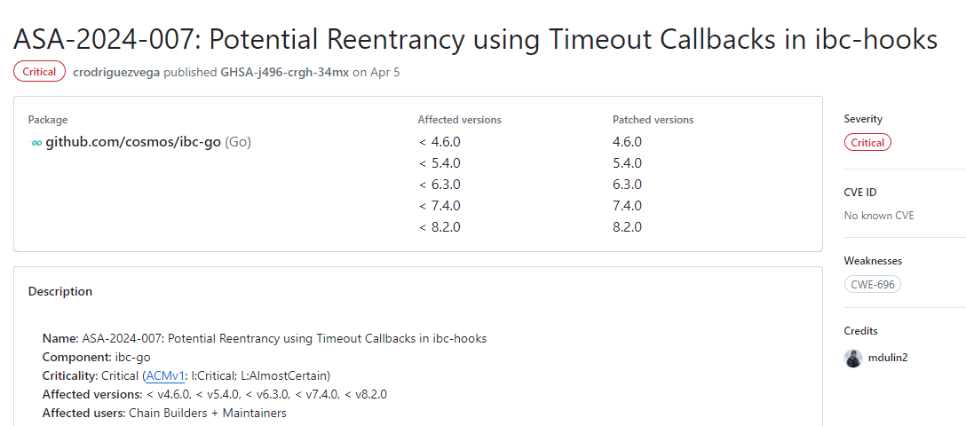 Nell’incidente di Terra blockchain, l’attaccante ha sfruttato una vulnerabilità di rientranza nel callback di timeout degli hook IBC associati a un modulo di terze parti. Il revisore contabile di smart contract Beosin indica che questa vulnerabilità è stata divulgata ad aprile. Pur essendo stato corretto, il bug è stato inavvertitamente reintrodotto in un aggiornamento della catena a giugno.
