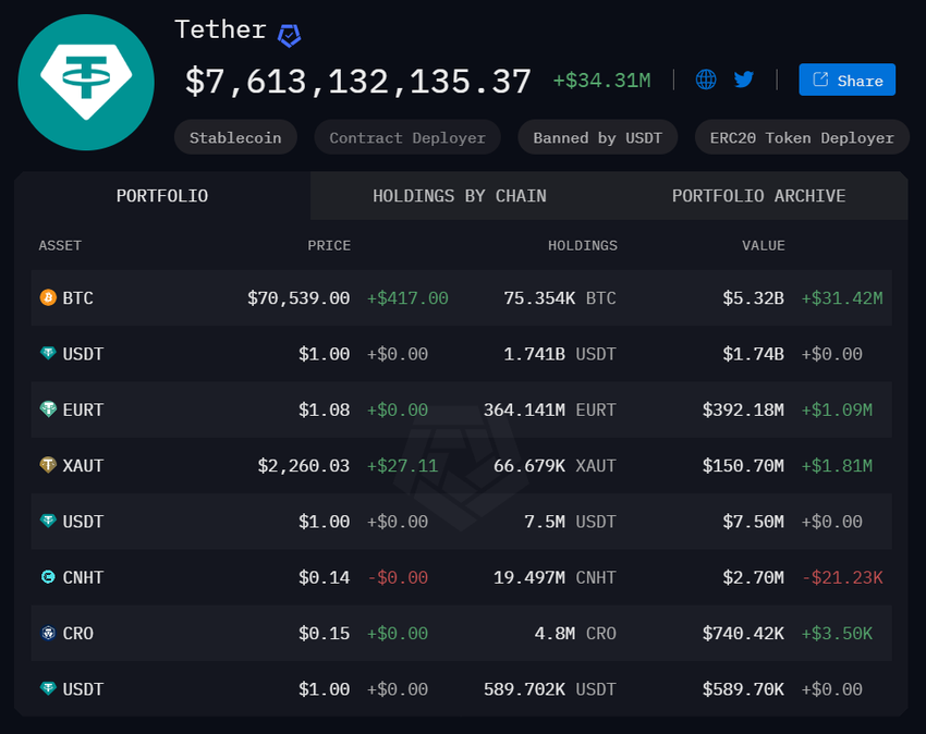 L’ultimo acquisto di Tether ha portato le sue riserve totali di Bitcoin a oltre 75.000 BTC, con un valore complessivo superiore a 5,3 miliardi di dollari.