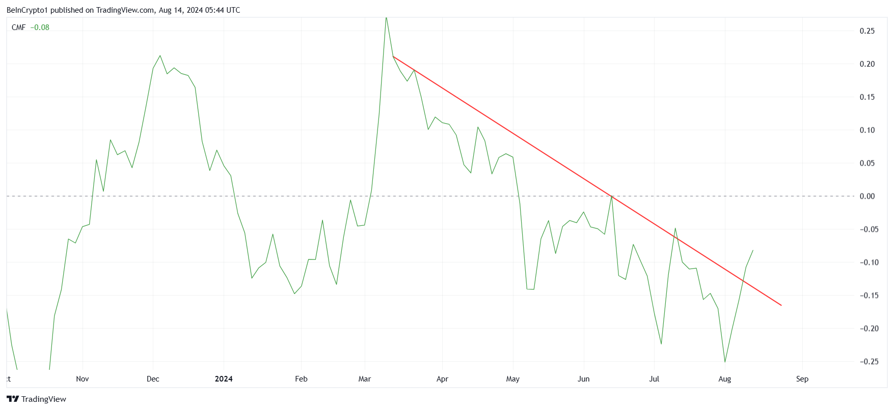 Il rialzo del prezzo di RUNE potrebbe essere oscurato dagli spunti ribassisti osservati al momento. L’indicatore Chaikin Money Flow (CMF) dell’altcoin rivela una tendenza persistente ai deflussi che ha dominato il mercato negli ultimi cinque mesi.