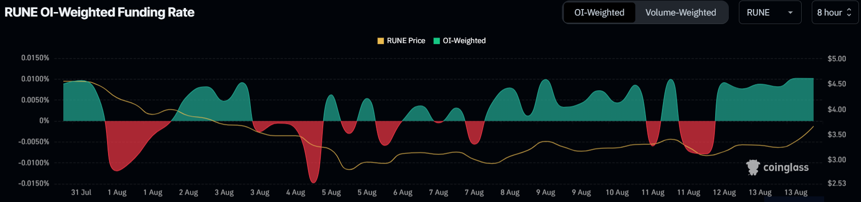 Il tasso di finanziamento che diventa spesso negativo indica un indebolimento della fiducia e dell’entusiasmo del mercato, che potrebbe contribuire ulteriormente alle sfide della ripresa di RUNE.