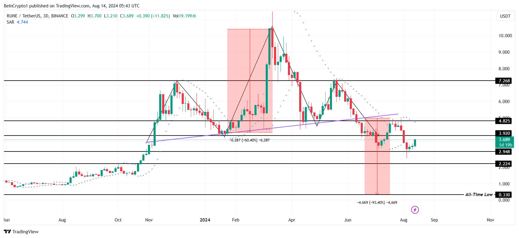 Al momento della scrittura, il prezzo di RUNE scambia a 3,68 dollari dopo aver rimbalzato sul supporto a 2,94 dollari. Sebbene la tendenza rialzista del mercato più ampio stia salvando l’asset crittografico da un forte ribasso, non è ancora sfuggito al modello.