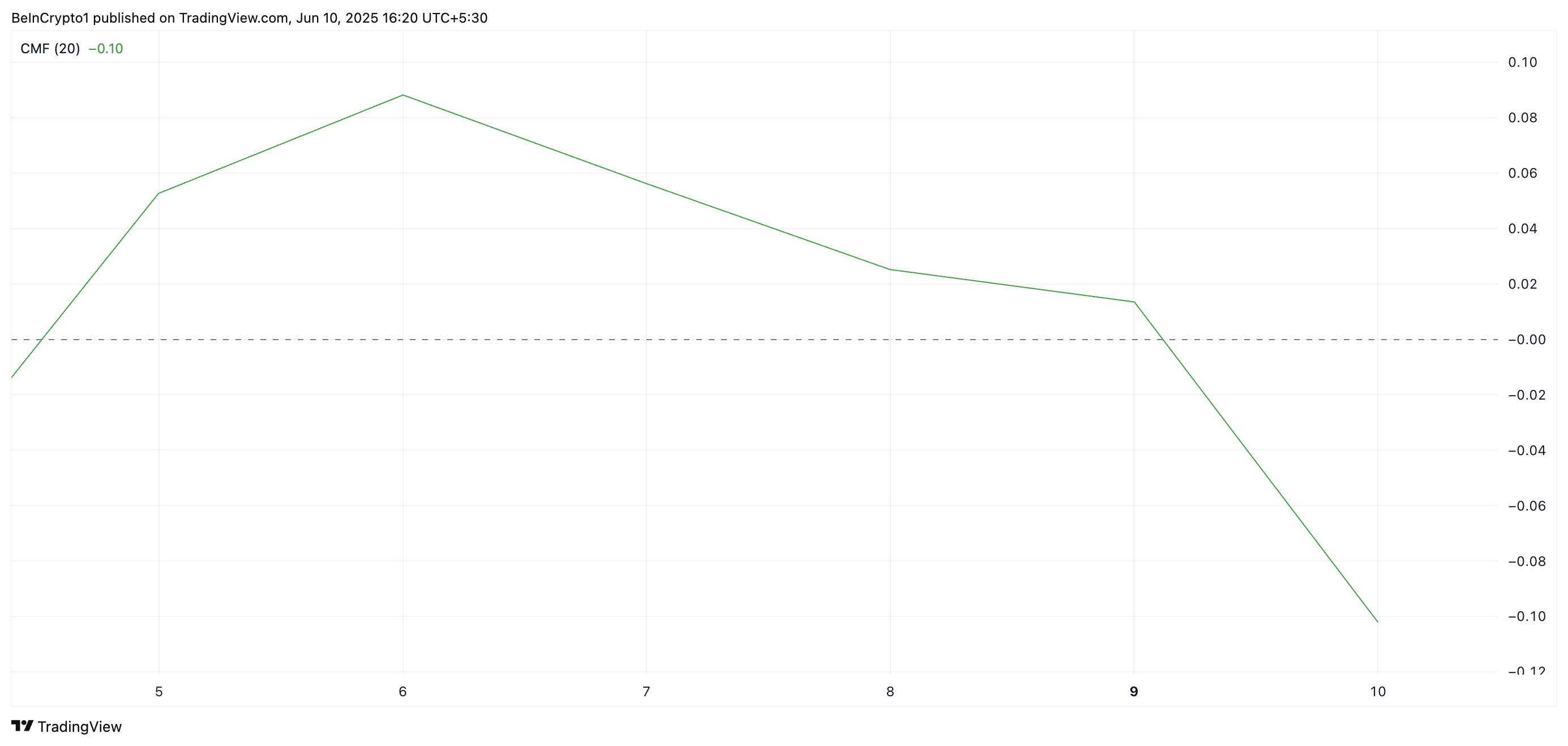 Le letture del grafico giornaliero PI/USD mostrano il Chaikin Money Flow (CMF) del token al di sotto della linea zero e in una tendenza al ribasso, formando una divergenza ribassista. Al momento della scrittura, questo indicatore si attesta a -0,10.