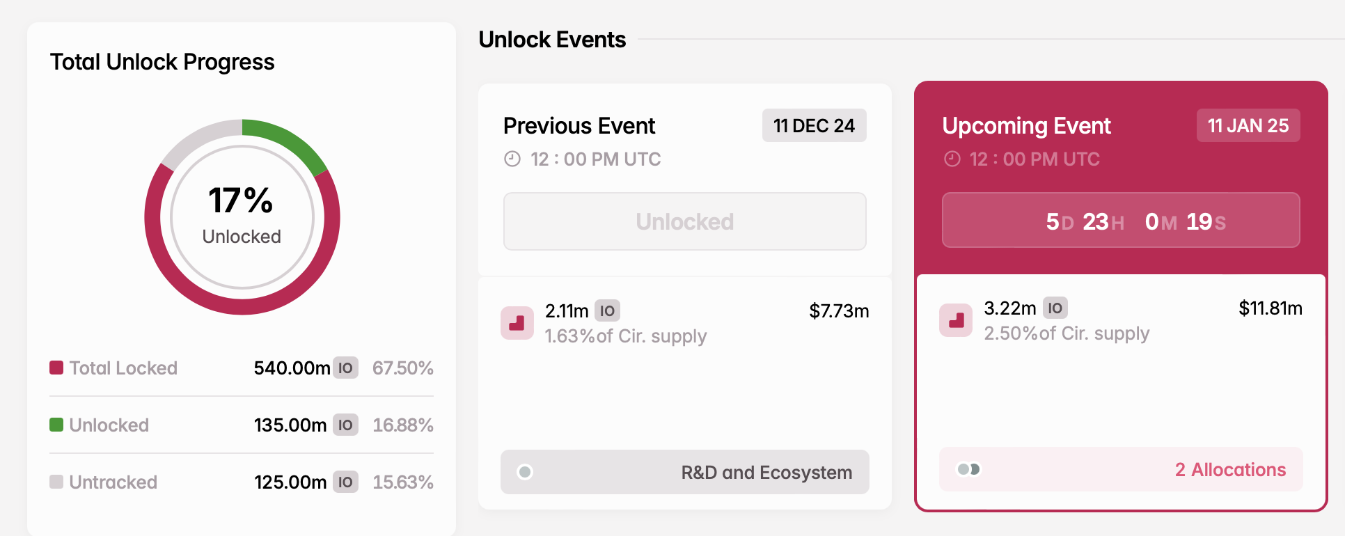 L’11 gennaio, io.net sbloccherà circa 3.22 milioni di token IO, che rappresentano circa il 2.50% dell’offerta circolante. Questi token sono destinati allo sviluppo della comunità e dell’ecosistema.