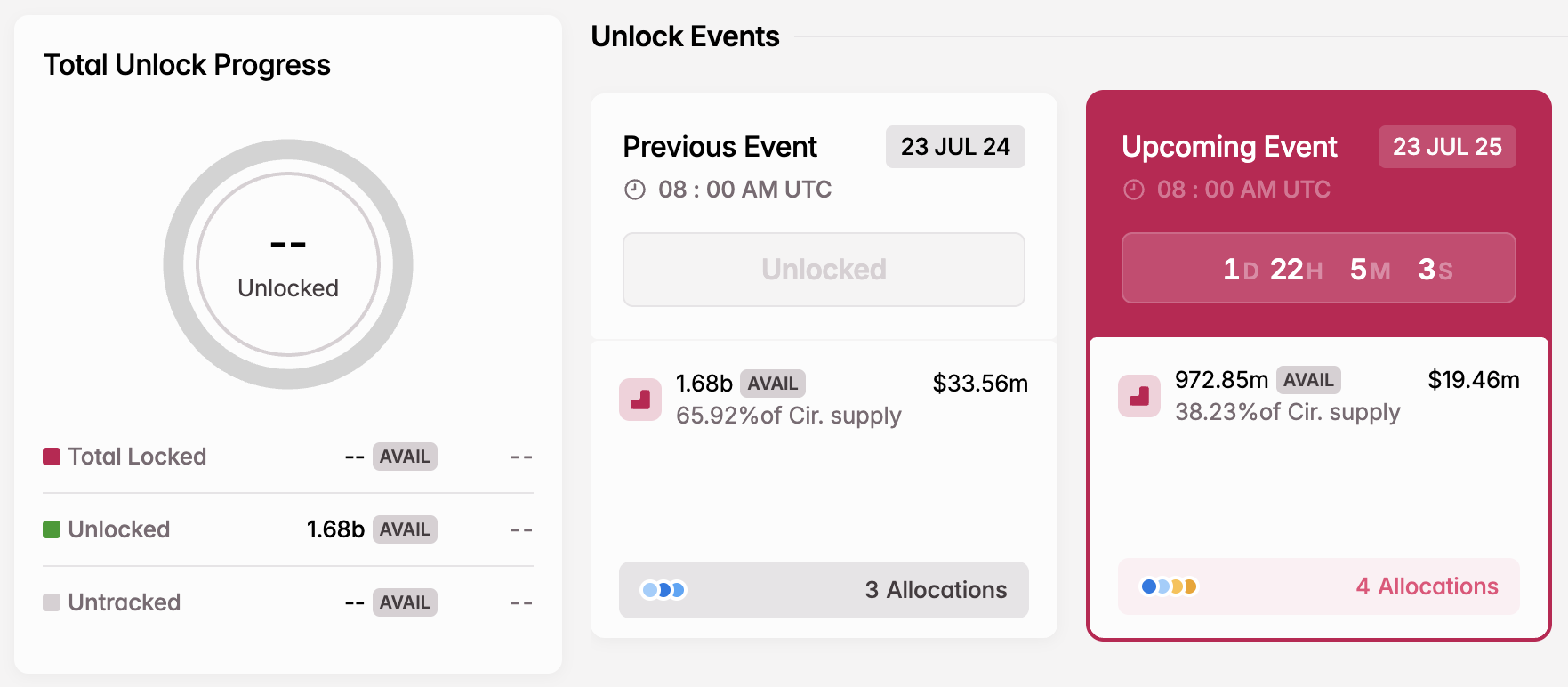 Il 23 luglio, il progetto sbloccherà 972,85 milioni di token AVAIL, valutati approssimativamente a $19,46 milioni. Questo è equivalente al 38,23% della fornitura circolante attuale.