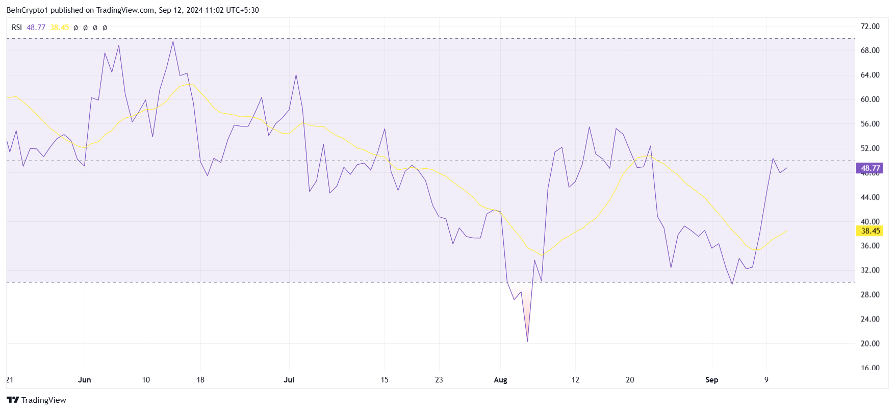 In secondo luogo, da una prospettiva macro, il momento rialzista di Toncoin si sta rafforzando, anche se un importante indicatore tecnico suggerisce una possibile sfida per il rally. L’indice di forza relativa (RSI), che misura il momento di un asset, è attualmente appena sotto la linea neutra di 50,0. Questa posizione indica che, sebbene il momento ascendente si stia costruendo, deve ancora trasformarsi completamente in un segnale rialzista.