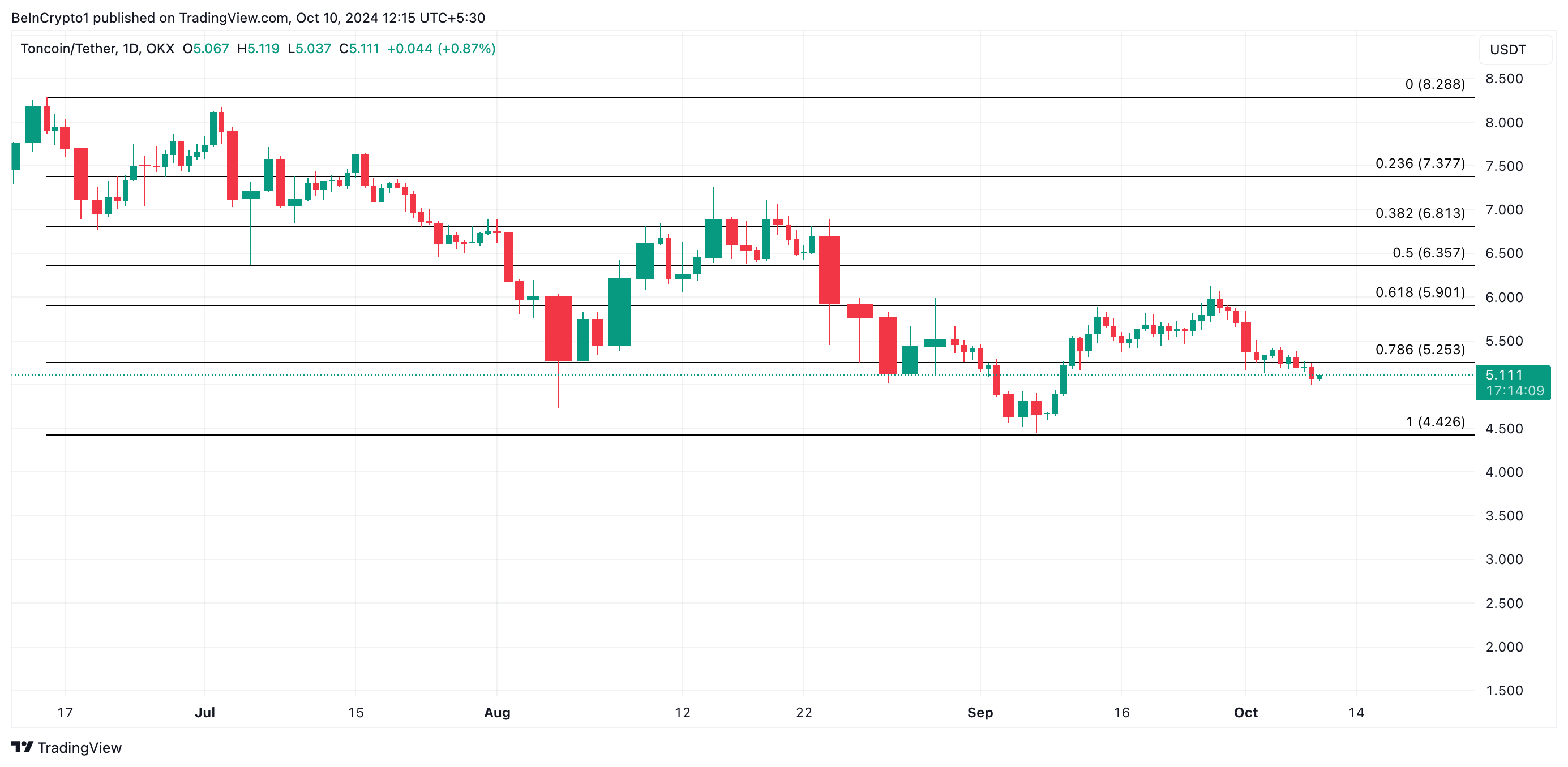 Se il calo persiste, il prezzo di TON potrebbe scendere a 4,42 USD, un minimo visto l’ultima volta il 6 settembre.