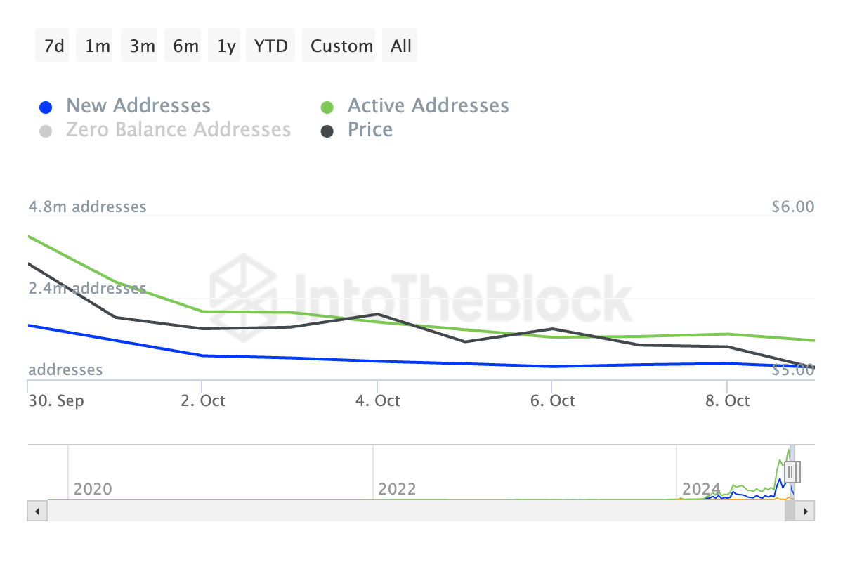 L’asset collegato a Telegram ha visto un forte calo nell’attività di acquisto, con indicatori chiave come indirizzi attivi giornalieri e nuovi, conteggi di grandi transazioni e transazioni redditizie che mostrano segni di debolezza.