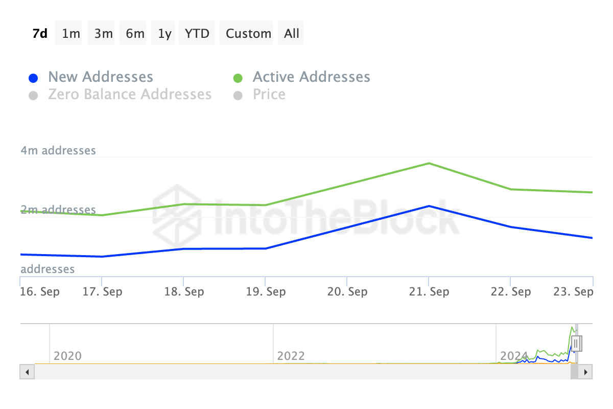 I dati di IntoTheBlock hanno rivelato un aumento degli indirizzi attivi giornalieri di TON negli ultimi sette giorni. Secondo il fornitore di dati on-chain, il conteggio giornaliero degli indirizzi che hanno completato almeno una transazione TON è aumentato del 29% in quel periodo. Analogamente, la nuova domanda per l’altcoin è salita del 78%.