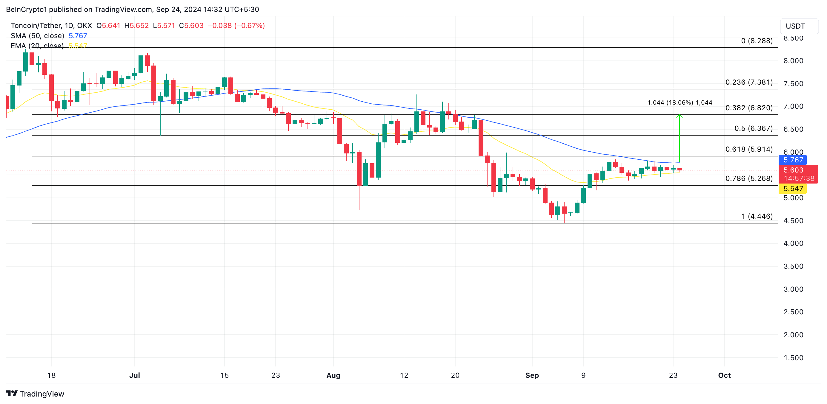 Il miglioramento del sentiment di mercato nell’ultima settimana ha portato a un aumento del prezzo di Toncoin (TON). Il token collegato a Telegram sta avanzando verso la sua media mobile semplice a 50 giorni (SMA).