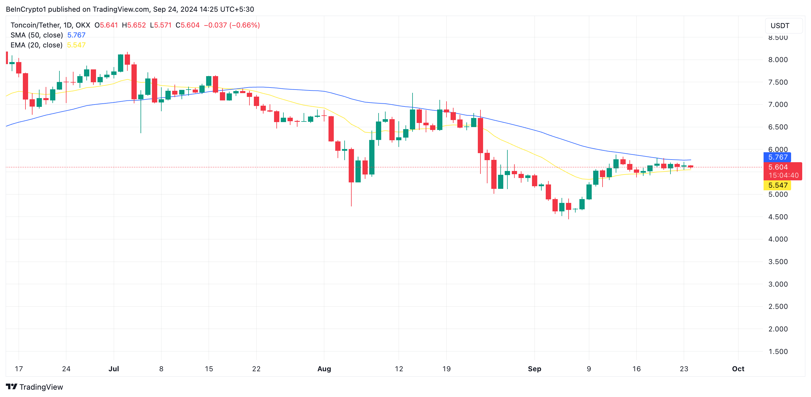 Nell’ultimo mese, la SMA a 50 giorni di TON, che rappresenta il prezzo di chiusura medio degli ultimi 50 giorni di trading, ha formato un livello chiave di resistenza a USD 5,76. Ogni tentativo di superare quel livello ha incontrato un picco di pressione di vendita, che ha riportato il prezzo di TON al supporto formato dalla sua media mobile esponenziale a 20 giorni (EMA) a USD 5,47.