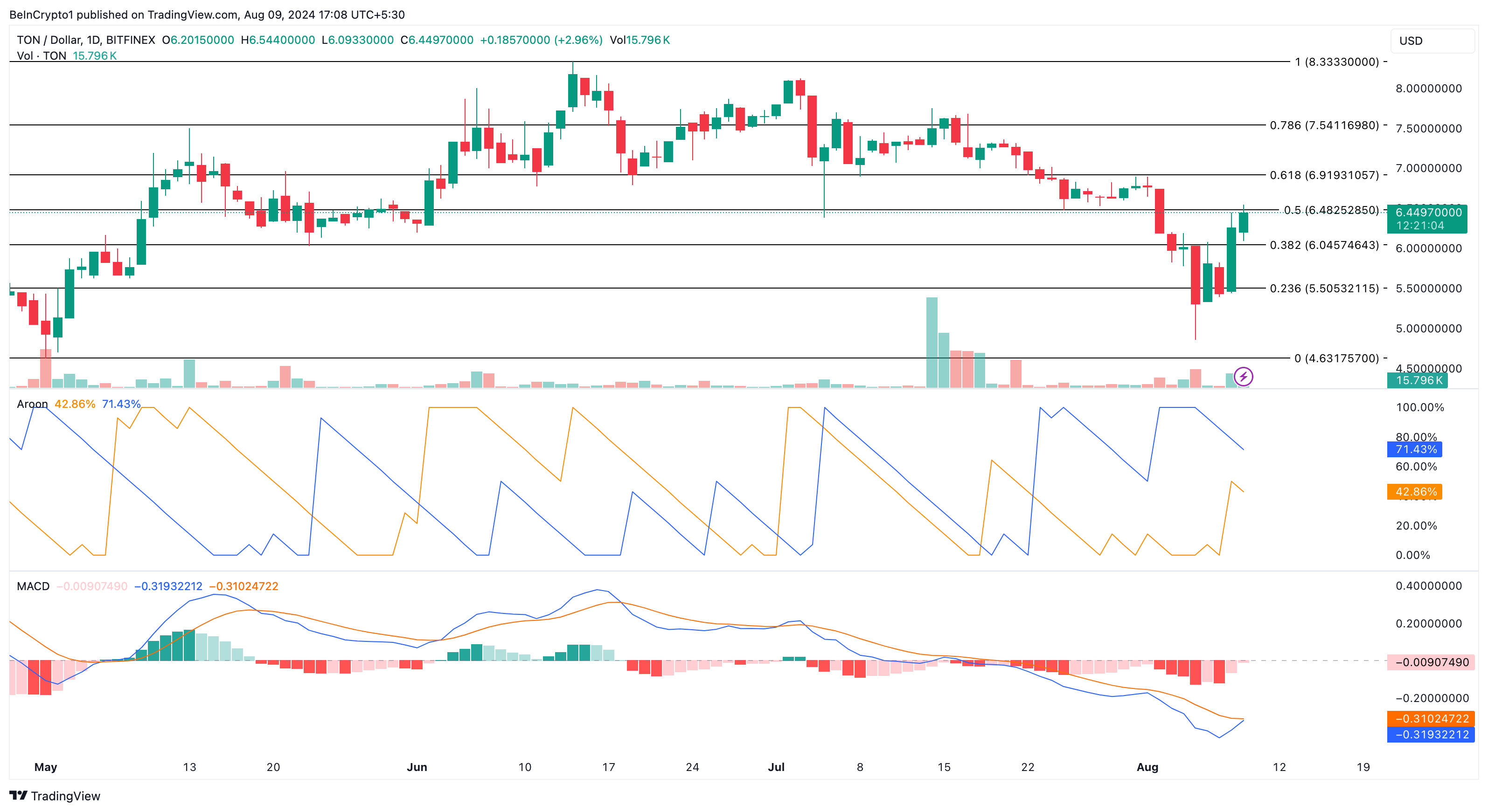 Toncoin scambia a 6,44 dollari e ha raggiunto questo punto dopo che Binance ha quotato la criptovaluta. Secondo il grafico giornaliero, TON è sul punto di cancellare le perdite subite tra il 1° e il 5 agosto.