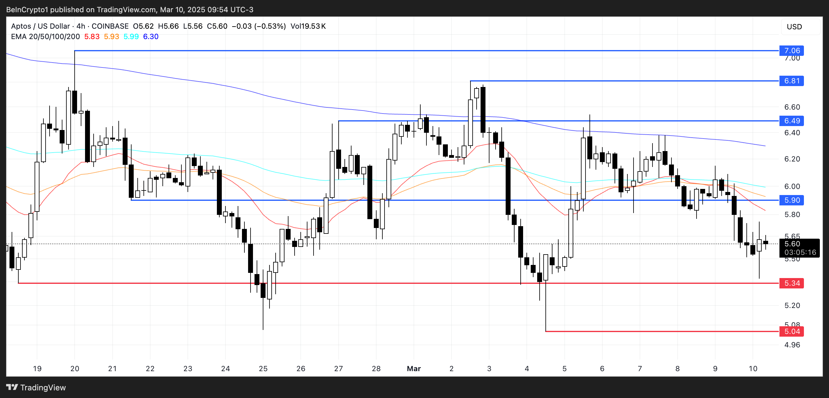 Se la correzione continua, APT potrebbe testare il supporto a $5,34, con un breakdown che potrebbe portarlo fino a $5,04. D’altra parte, un’inversione potrebbe vedere APT salire verso $5,90, con ulteriore resistenza a $6,49.