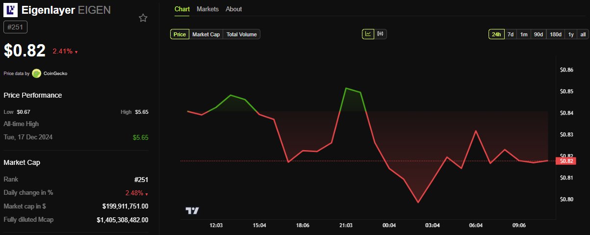 Al momento della pubblicazione, il token di potenza di EigenLayer, EIGEN, era scambiato a $0,82. Questo rappresenta un calo di oltre 2% nelle ultime 24 ore.