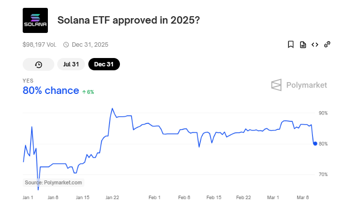 I partecipanti al mercato delle crypto sono cautamente ottimisti. Il mercato delle previsioni Polymarket stima un’alta probabilità (fino all’80%) di approvazione nel 2025.