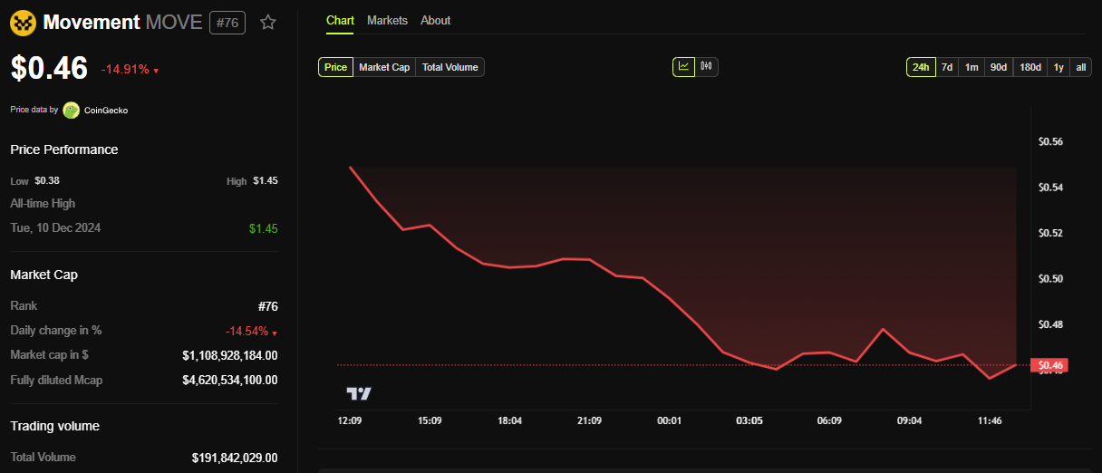 Il token MOVE alimenta le commissioni di gas, lo staking e la governance. È stato lanciato a dicembre 2024 con un airdrop del 10% tramite MoveDrop. Gli investitori dovrebbero prepararsi alla volatilità del prezzo intorno a MOVE, che viene scambiato a $0,46 al momento della scrittura.