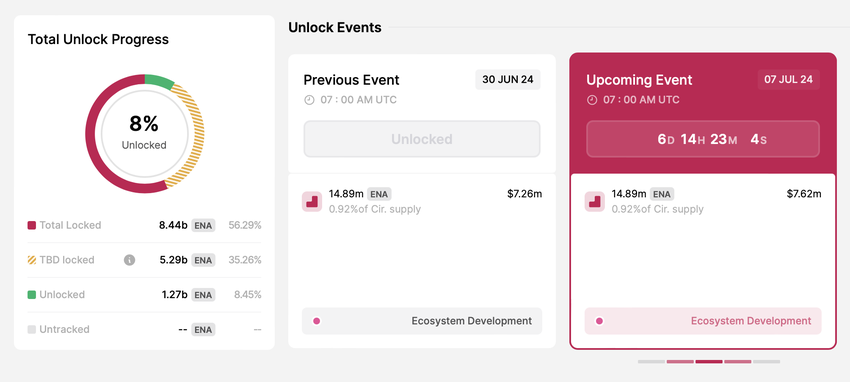 Ethena (ENA), il protocollo di valuta sintetica su Ethereum, sbloccherà 14,89 milioni del suo token nativo, ENA, dedicato allo sviluppo dell’ecosistema. Secondo i dati di Token Unlocks, questi token rappresentano lo 0,92% dell’offerta circolante di ENA e hanno un valore di circa 7,62 milioni di dollari al momento della scrittura.
