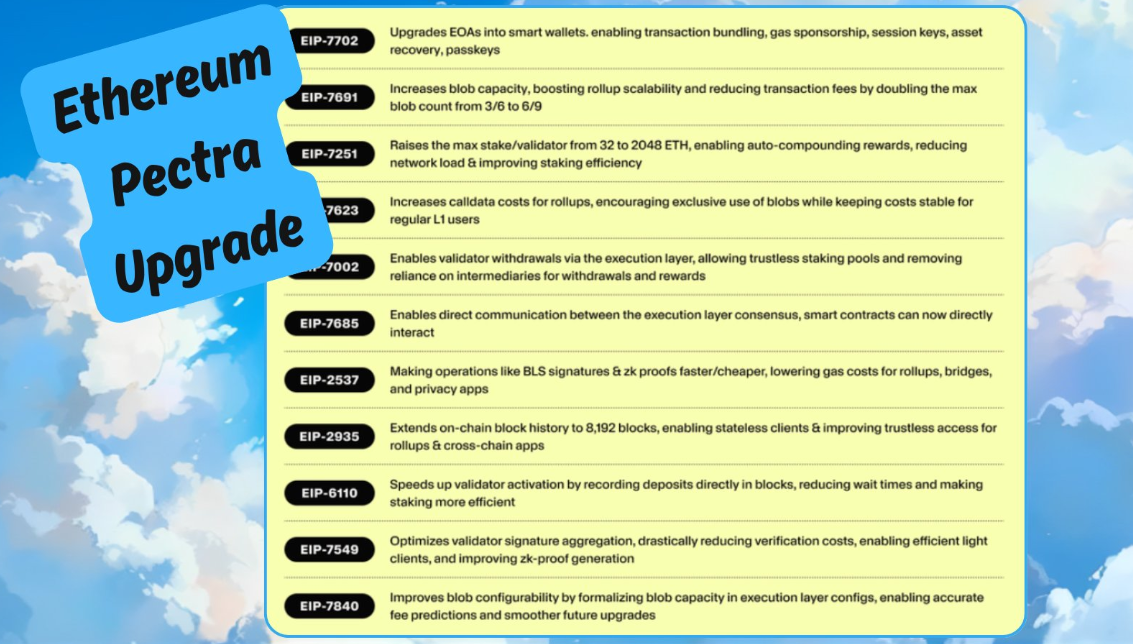 Il 7 maggio, la rete Ethereum attiverà il tanto atteso Pectra Upgrade, con 11 Ethereum Improvement Proposals (EIPs) previsti per l’implementazione.
