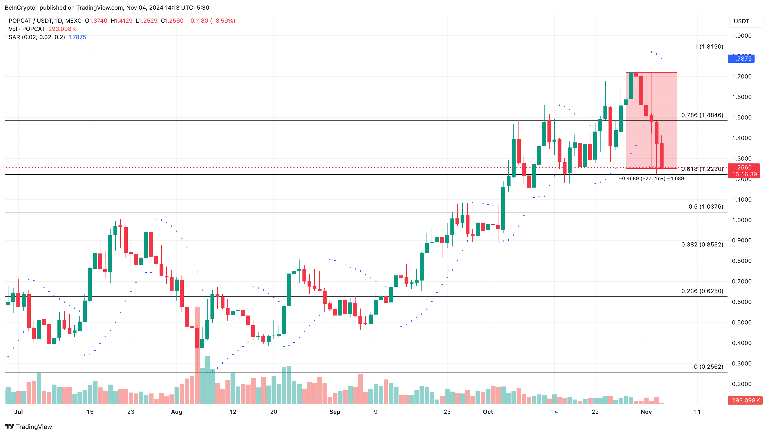Sul grafico giornaliero, il prezzo di POPCAT è sceso a USD 1,28. Inoltre, l’indicatore Parabolic Stop and Reverse (SAR) si trova sopra il valore del memecoin. Questo indicatore tecnico aiuta a identificare la direzione del prezzo di un asset, segnalando un potenziale ribasso per POPCAT.